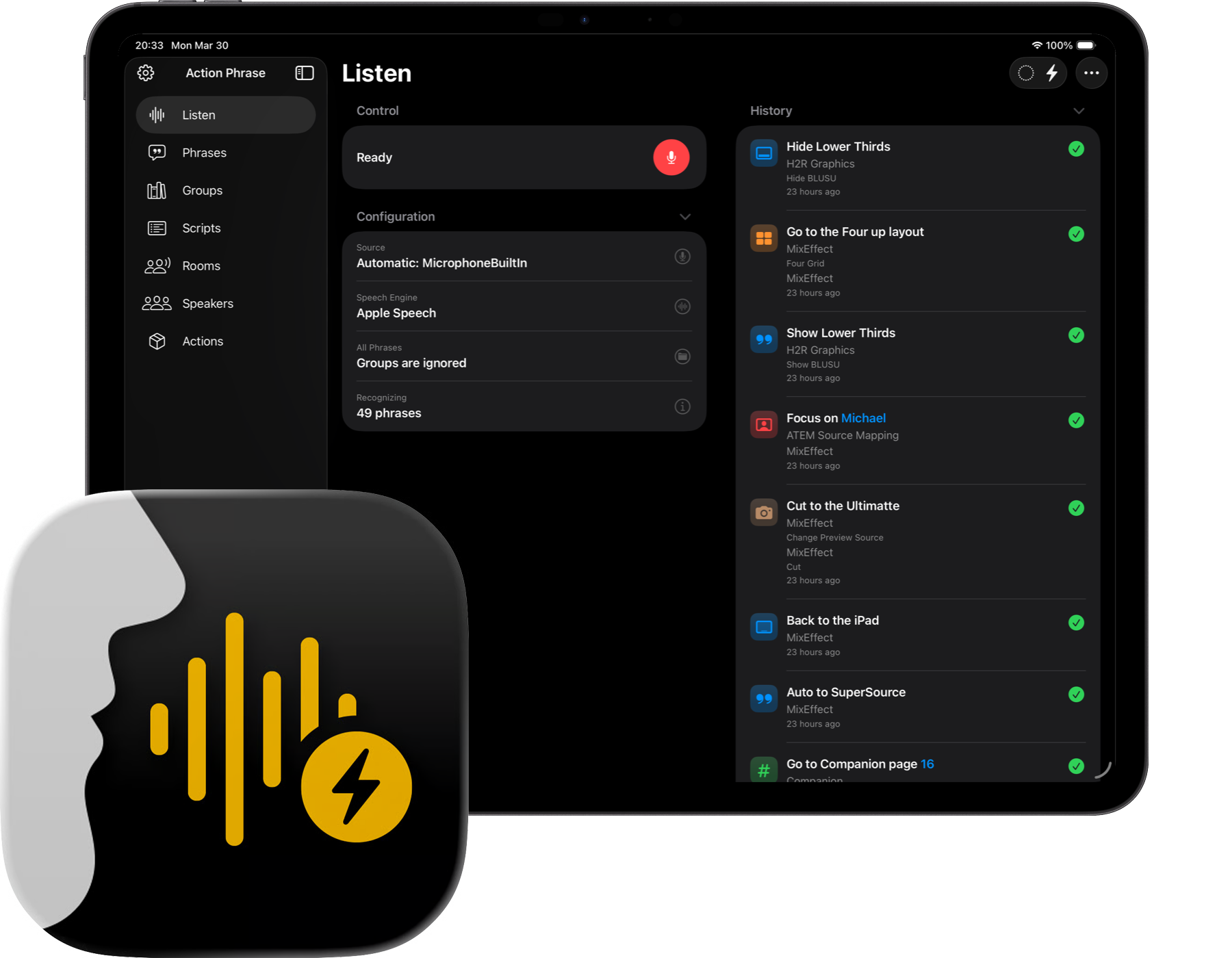 Action Phrase controls popular live production software, hardware, and services through spoken Phrases, automates cues as you move through prepared Script sections, and responds in real time in multi-speaker environments through Rooms.