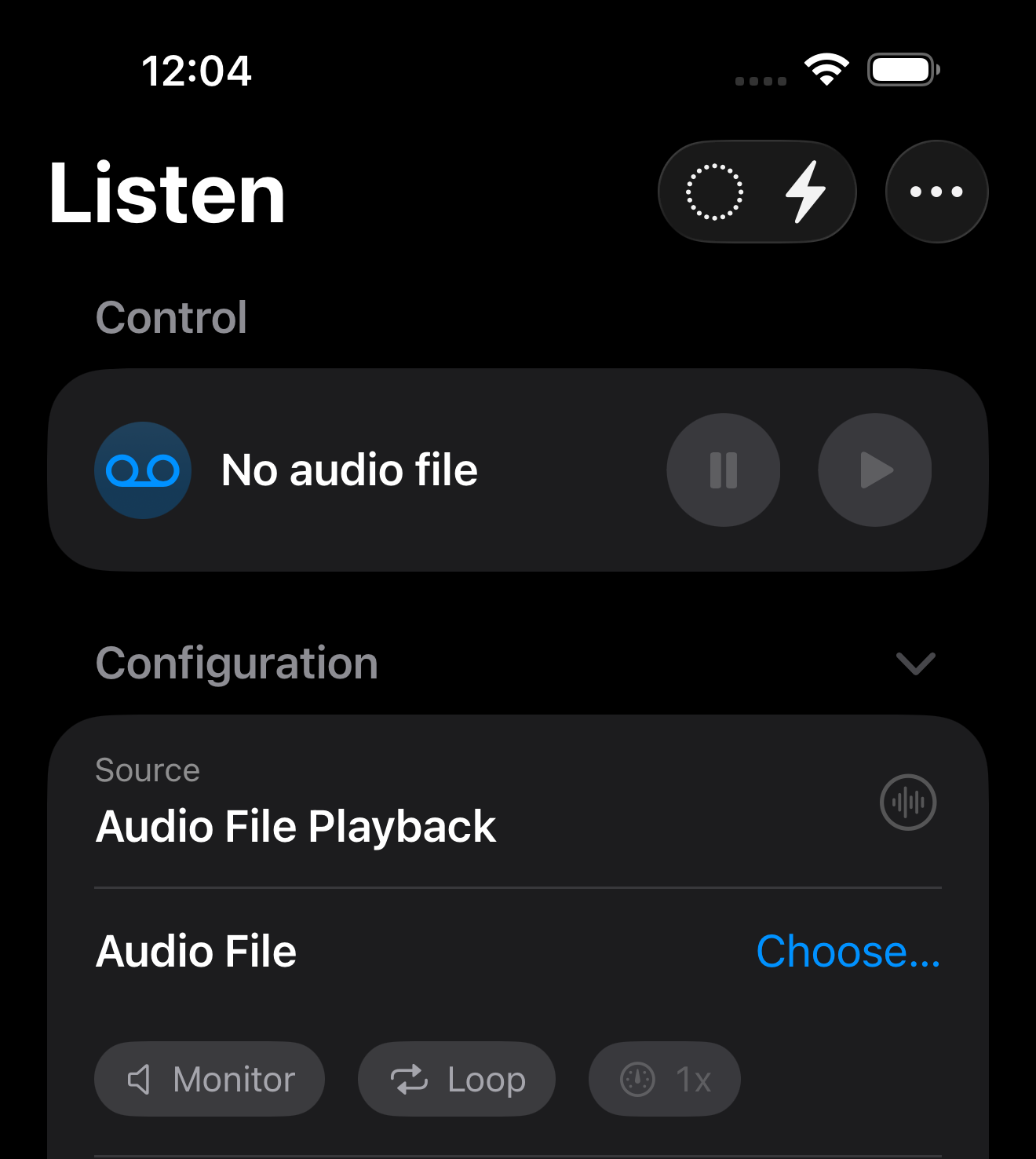 If audio file playback is chosen as the input source, pause and start/stop playback buttons will replace the star/stop listening button.