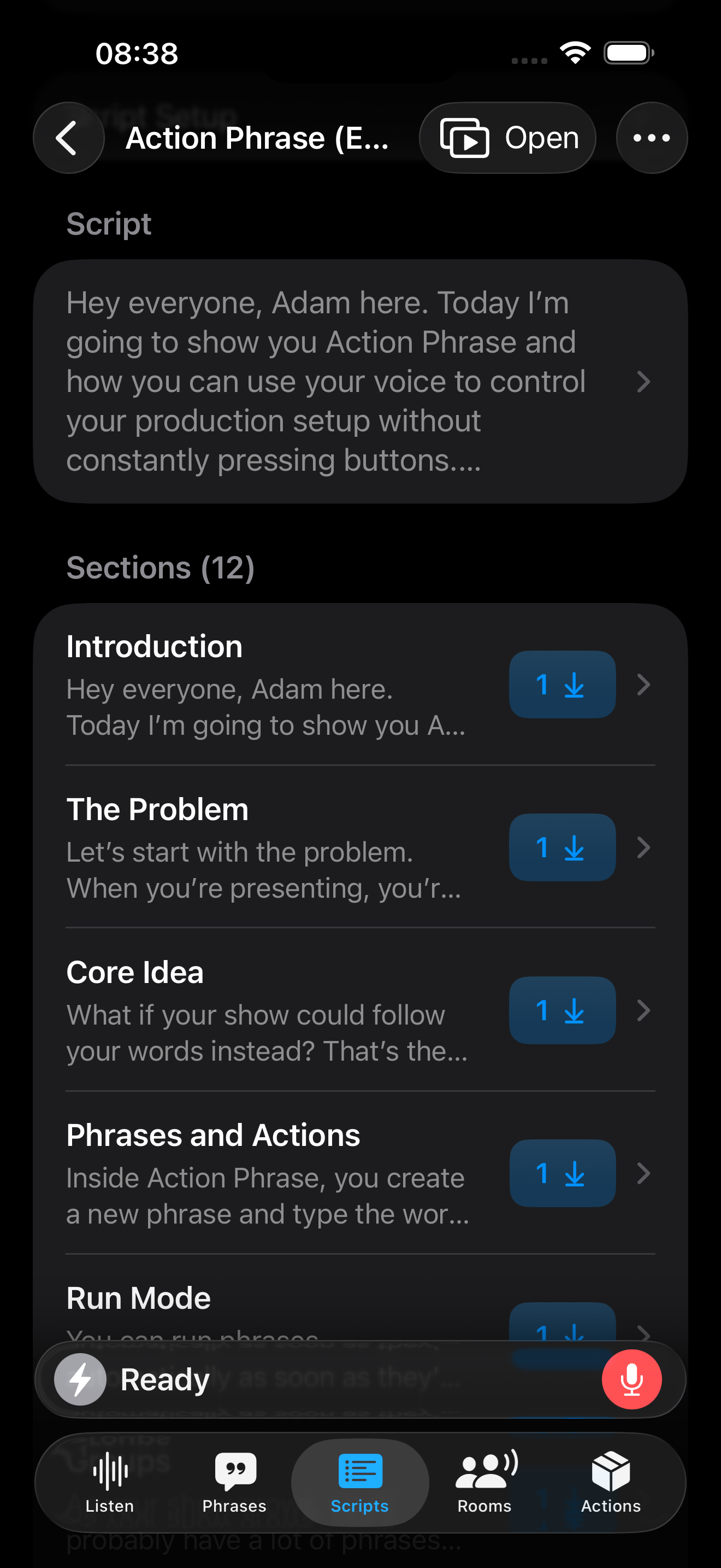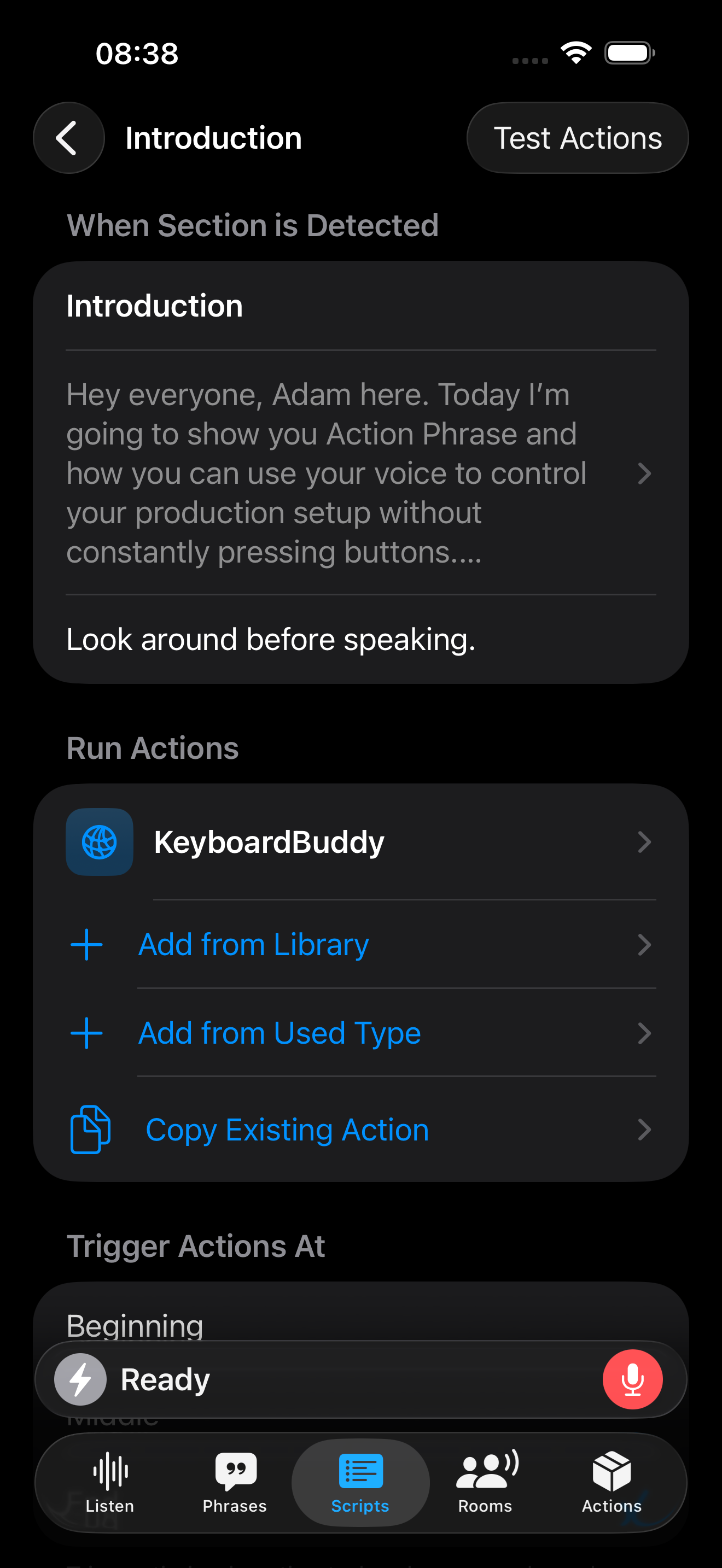 When in an active Script session, you'll speak out your script. Action Phrase will automatically detect when you have reached a certain section in the script. It can then run actions that you have defined for the section.