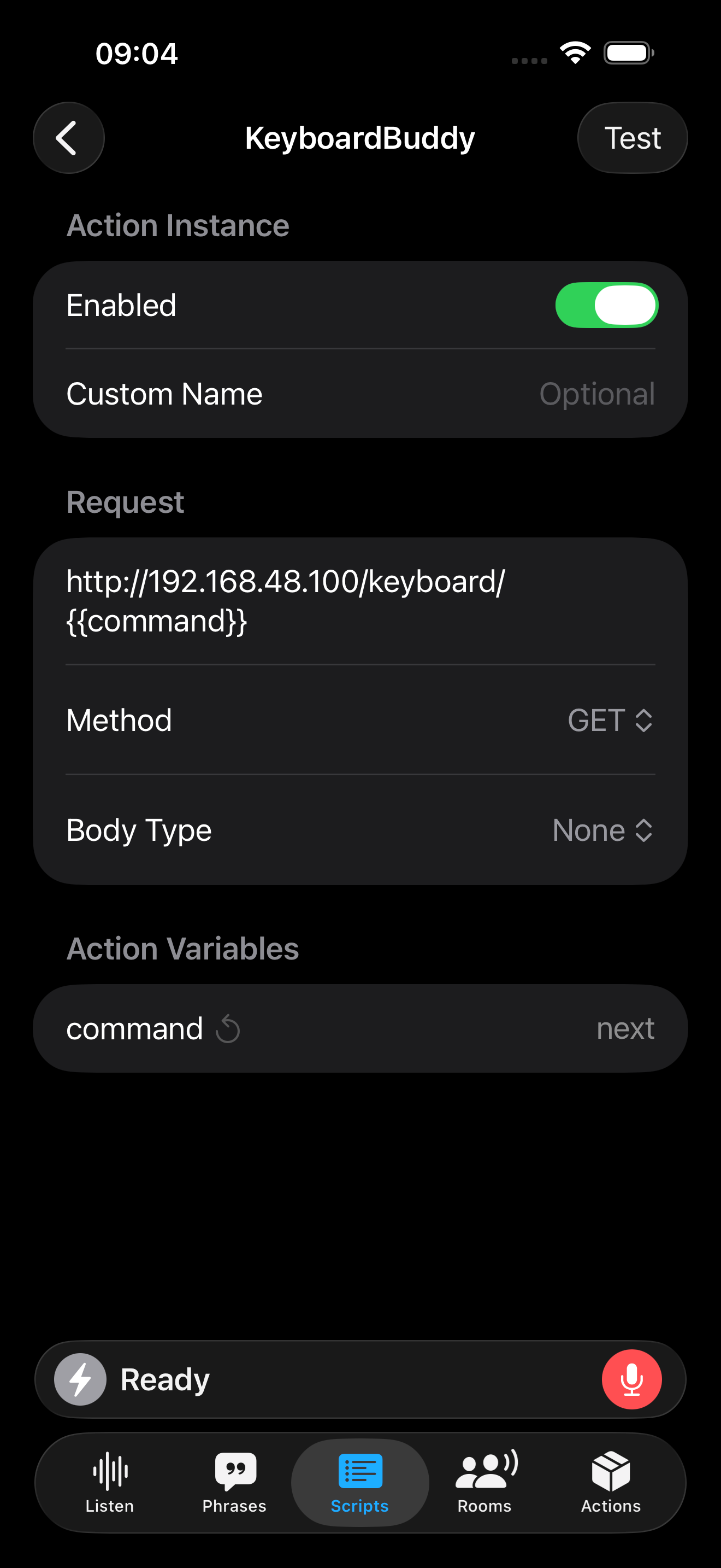 - When the Introduction script session is detected, a Web Request action called KeyboardBuddy will run