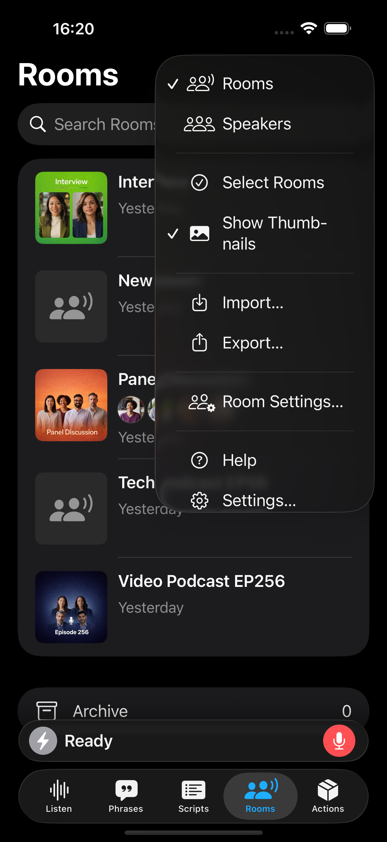 - Tab Layout: Speakers is located under the Rooms tab. Tap on the Rooms title or tap the More Menu and choose Speakers.